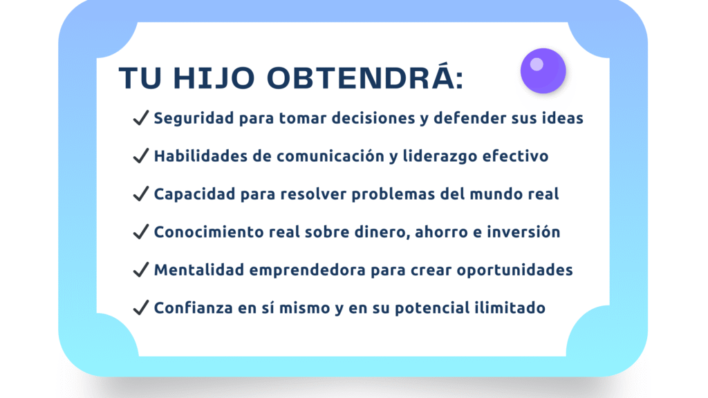 Diseñado para que los más pequeños descubran el mundo del emprendimiento de forma práctica y segura. Con juegos, retos creativos, este programa desarrolla habilidades como liderazgo, ahorro y resolución de problemas. Ideal para despertar desde temprano una mentalidad proactiva, curiosa y segura.
